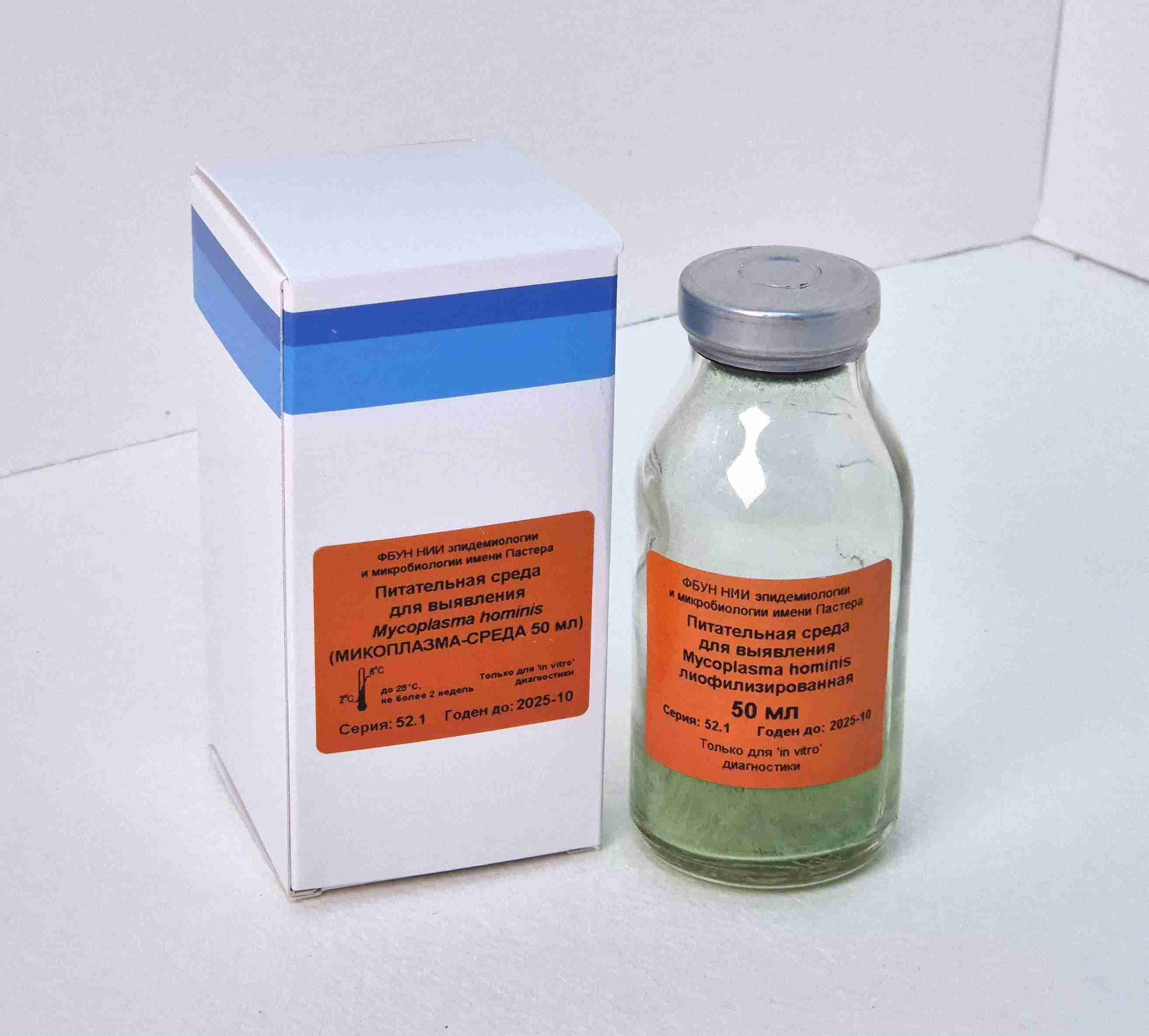 Отдельный компонент набора реагентов для визуального выявления Mycoplasma hominis (МИКОПЛАЗМА-50). Среда прошла регистрацию в составе набора Микоплазма-50 (№ ФСР 2009/05983 от 16.08.2011). Среда предназначена для одноэтапного визуального выявления Mycoplasma hominis (M. h.) в отделяемом из цервикального канала и влагалища, в семенной жидкости, в секрете предстательной железы, в отделяемом уретры и в центрифугате мочи. Флакон рассчитан на проведение 50 анализов в пробирках для микропроб. Комплектность: питательная среда для выявления M. h., лиофилизированная (50 мл) - 1 фл. Область применения – для научных исследований.