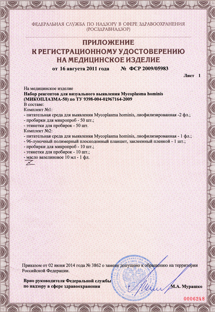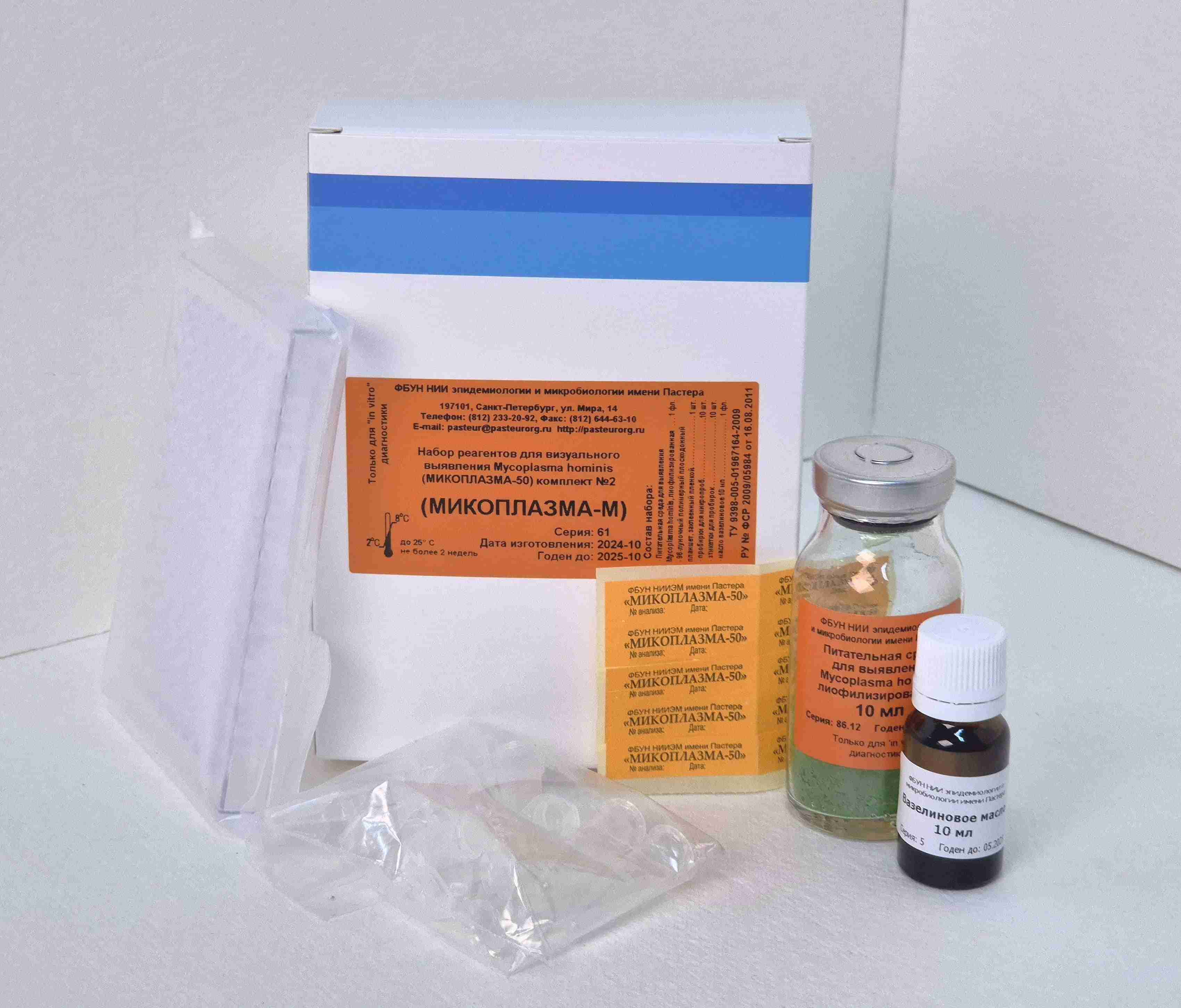 Набор реагентов МИКОПЛАЗМА-М предназначен для одноэтапного визуального выявления Mycoplasma hominis (M. h.) в отделяемом из цервикального канала и влагалища, в семенной жидкости, в секрете предстательной железы, в отделяемом уретры и в центрифугате мочи. Набор рассчитан на проведение 96 анализов в лунках планшета. Состав: питательная среда для выявления M. h., лиофилизированная (10 мл) - 1 фл.; 96-луночный полимерный плоскодонный планшет - 1 шт.; пробирки для микропроб - 10 шт.; этикетки для маркировки пробирок - 10 шт.; масло вазелиновое - 1 фл. (10 мл). Область применения – для научных исследований.
