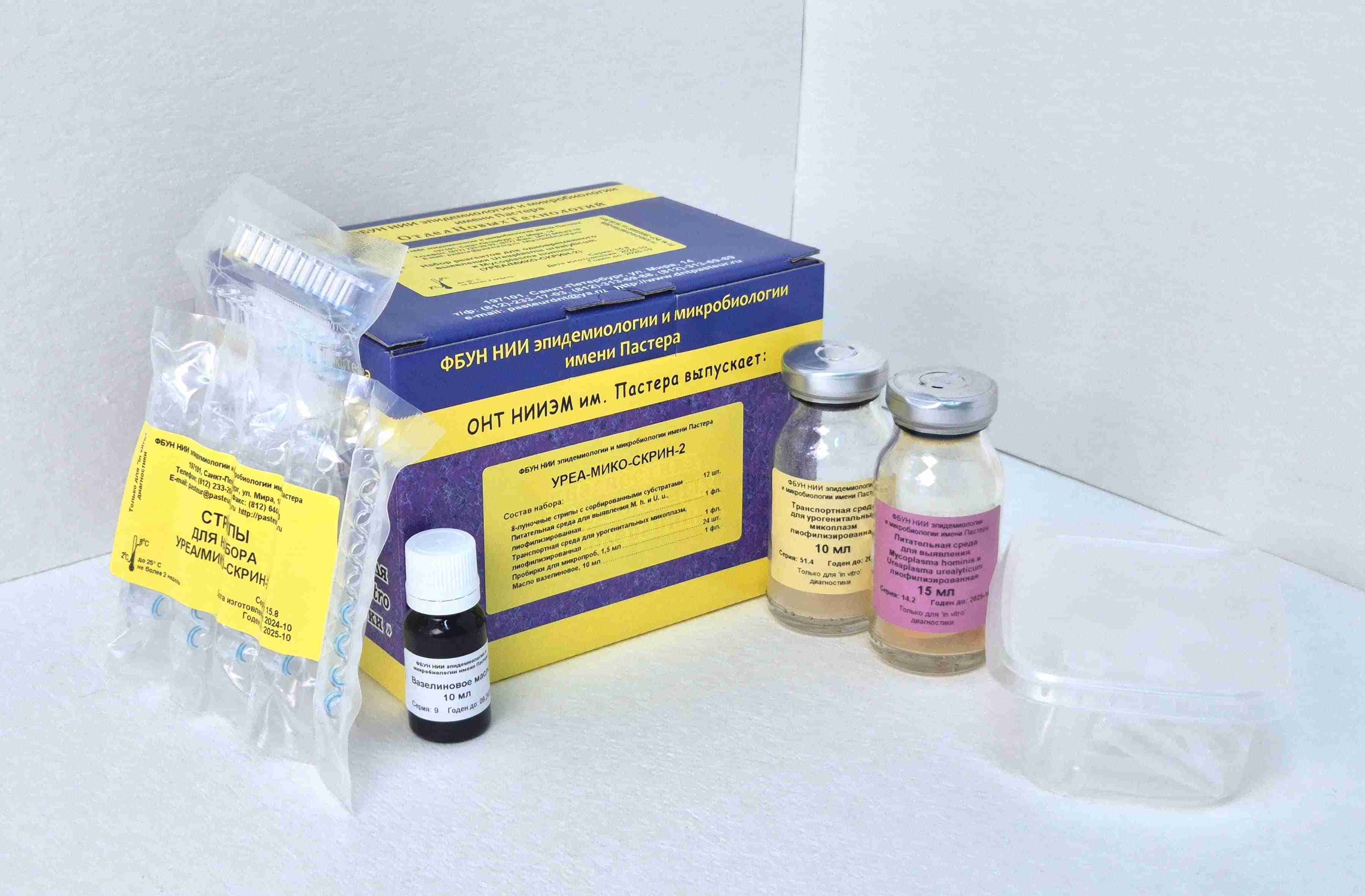 Набор реагентов УРЕА/МИКО-СКРИН-2 предназначен для одновременного выявления и идентификации двух видов урогенитальных микоплазм: Ureaplasma urealyticum (U. u.) и Mycoplasma hominis (M. h.). Набор рассчитан на проведение 12 анализов, включая контроли. Состав: 8-луночные стрипы с сорбированными субстратами - 12 шт.; питательная среда для выявления M. h. и U. u., лиофилизированная - 1 фл.; транспортная среда для урогенитальных микоплазм, лиофилизированная - 1 фл.; пробирки для микропроб - 24 шт.; масло вазелиновое - 1 фл. (10 мл). Область применения – клиническая медицина.