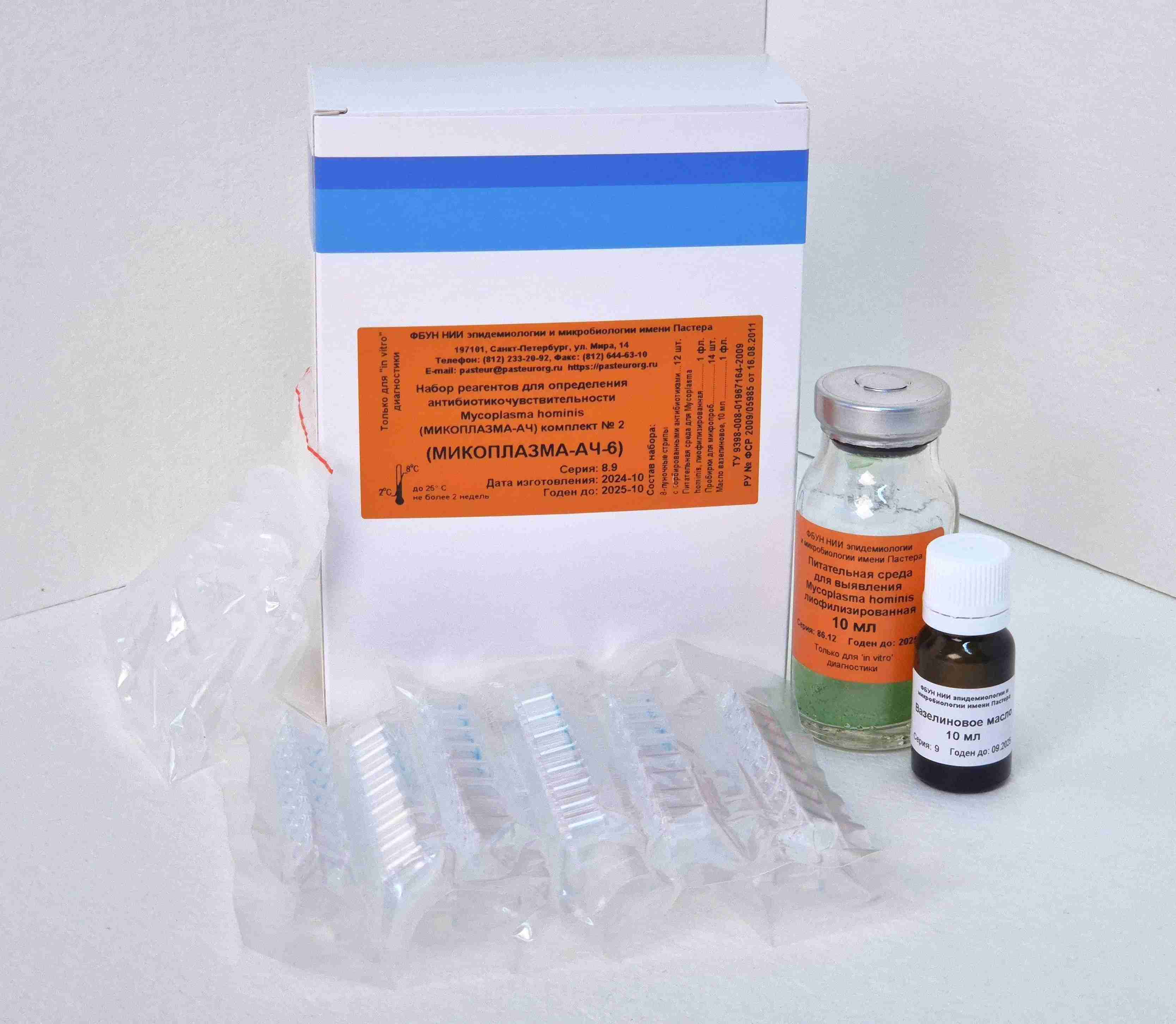 Набор МИКОПЛАЗМА-АЧ-6 предназначен для одноэтапного обнаружения, идентификации и определения чувствительности Mycoplasma hominis (M. h.) к 6 антибиотикам (доксициклин, джозамицин, мидекамицин, офлоксацин, левофлоксацин, клиндамицин), наиболее часто назначаемым при лечении урогенитальных микоплазмозов. Все антибиотики представлены в концентрациях, позволяющих оценить исследуемые штаммы M. h. как чувствительные или резистентные. Набор рассчитан на проведение 12 анализов, включая контроли. Состав: 8-луночные стрипы с сорбированными антибиотиками - 12 шт.; питательная среда для выявления M. h., лиофилизированная - 1 фл.; масло вазелиновое - 1 фл. (10 мл).; пробирки для микропроб - 14 шт. Область применения – клиническая медицина.