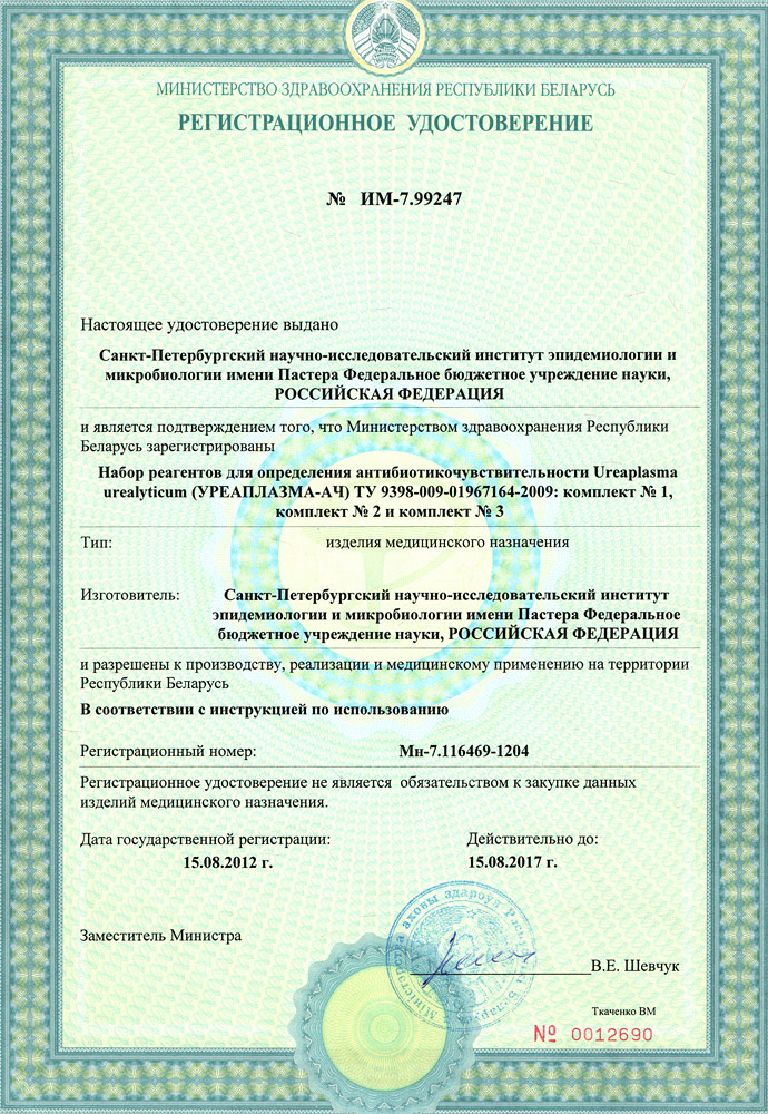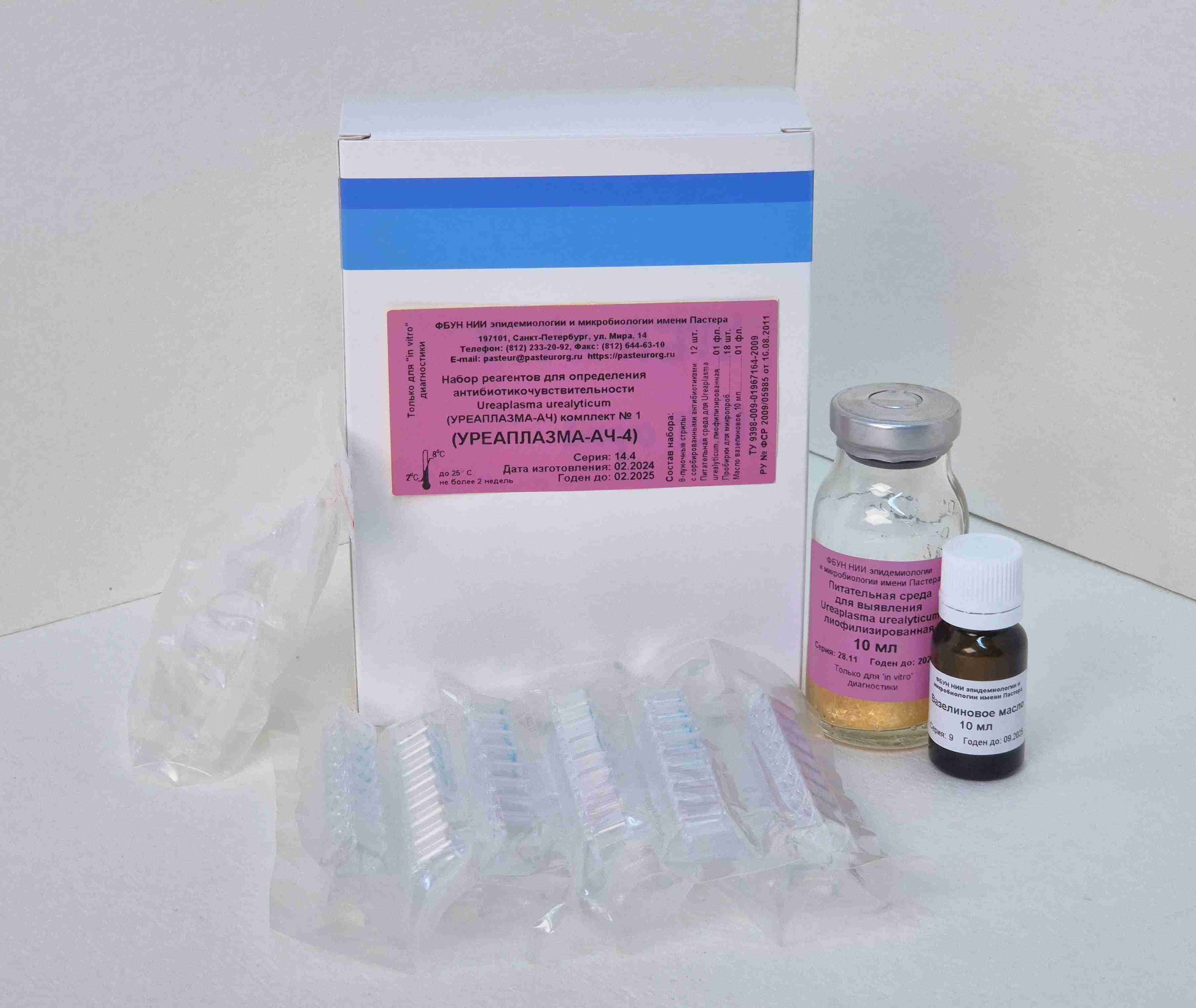 Набор реагентов УРЕАПЛАЗМА-АЧ-4 предназначен для одноэтапного обнаружения, идентификации, полуколичественной оценки титра и определения чувствительности Ureaplasma urealyticum (U. u.) к 4 антибиотикам (эритромицин, азитромицин, джозамицин, спирамицин), наиболее часто назначаемым при лечении урогенитальных микоплазмозов. Все антибиотики представлены в концентрациях, позволяющих оценить исследуемые штаммы U. u. как чувствительные или резистентные. Набор рассчитан на проведение 12 анализов, включая контроли. Состав: 8-луночные стрипы с сорбированными антибиотиками - 12 шт.; питательная среда для выявления U. u., лиофилизированная - 1 фл.; масло вазелиновое - 1 фл. (10 мл).; пробирки для микропроб - 18 шт. Область применения – клиническая медицина.