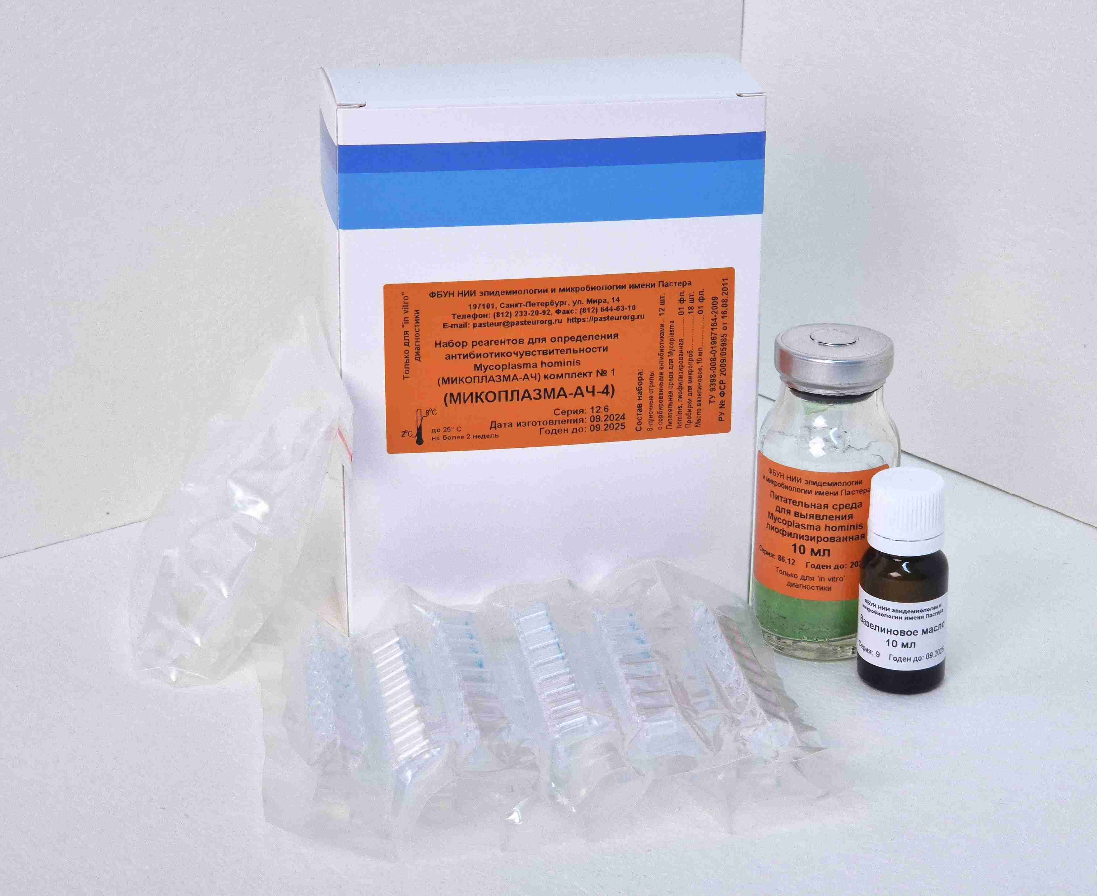 Набор МИКОПЛАЗМА-АЧ-4 предназначен для одноэтапного обнаружения, идентификации, полуколичественной оценки титра и определения чувствительности Mycoplasma hominis (M. h.) к 4 антибиотикам (эритромицин, азитромицин, джозамицин, спирамицин), наиболее часто назначаемым при лечении урогенитальных микоплазмозов. Все антибиотики представлены в концентрациях, позволяющих оценить исследуемые штаммы M. h. как чувствительные или резистентные. Набор рассчитан на проведение 12 анализов, включая контроли. Состав: 8-луночные стрипы с сорбированными антибиотиками - 12 шт.; питательная среда для выявления M. h., лиофилизированная - 1 фл.; масло вазелиновое - 1 фл. (10 мл).; пробирки для микропроб - 18 шт. Область применения – клиническая медицина.