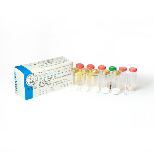 Набор предназначен для выявления антител к вирусу кори в сыворотках крови людей и в препаратах иммуноглобулина человека. Состав: диагностикум эритроцитарный коревой антигенный, сухой 3% - 5 фл. по 2 мл; сыворотка кроличья нормальная сухая 10% - 5 фл. по 2 мл; эритроциты барана, акролеинизированные несенсибилизированные, суспензия 30%; иммуноглобулин человека нормальный жидкий - 1 амп. 1,5 мл. Область применения – клиническая медицина.