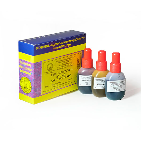 Набор предназначен для определения грампринадлежности бактерий в модификации, когда грамположительная флора имеет зеленую окраску, а грамотрицательная флора - красную. Такое сочетание цветов обеспечивает резкую контрастность при окраске гонококков. Состав: раствор бриллиантового зеленого - 1 фл. (15 мл); раствор йодного спирта - 1 фл. (25 мл); раствор сафранина - 1 фл. (25 мл); Инструкция по применению – 1 шт. Область применения – для научных исследований.