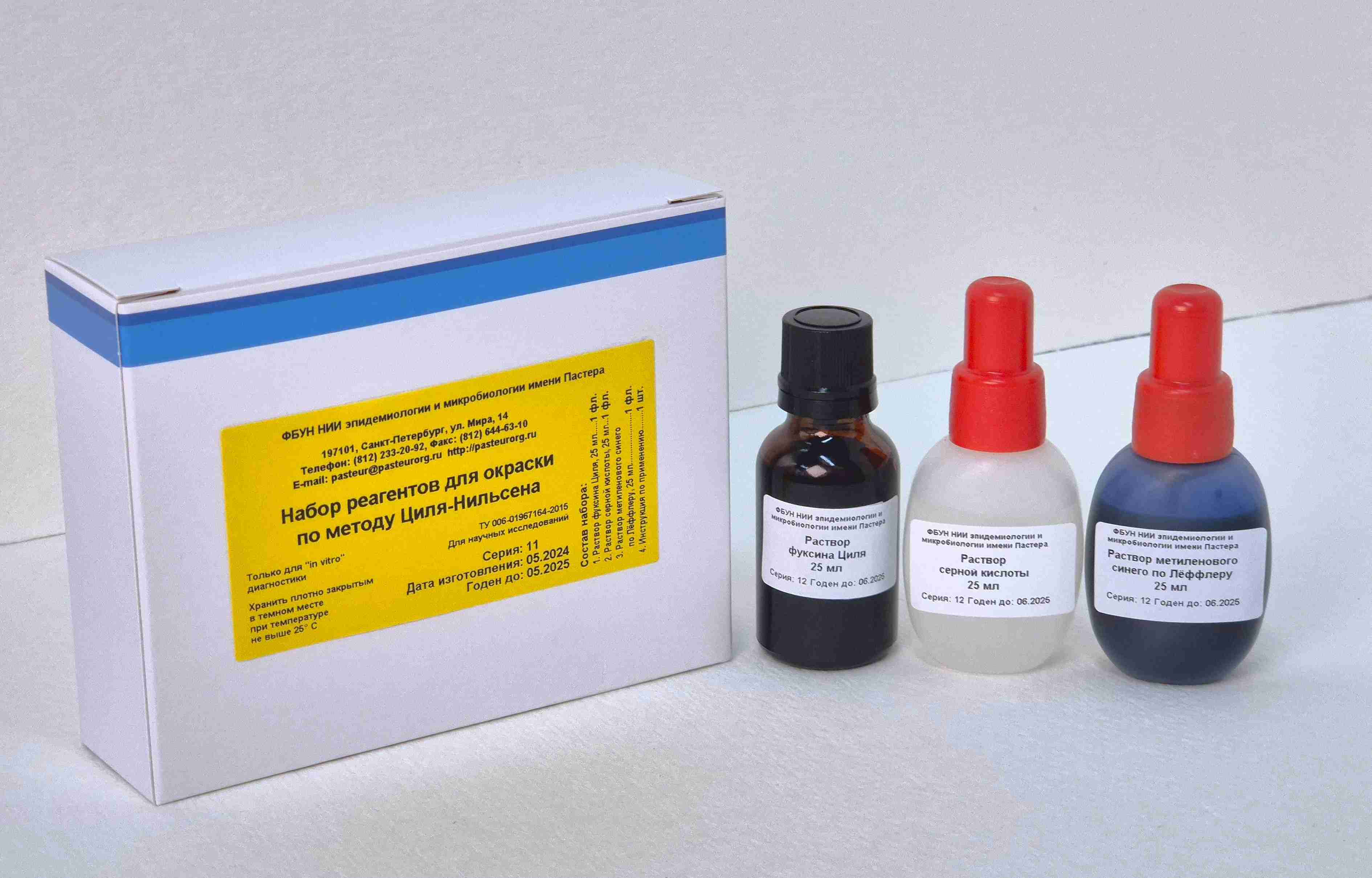 Набор предназначен для дифференциальной окраски и выявления микроорганизмов с кислотоустойчивыми свойствами, которые обусловлены химическим составом клеточной стенки. Эти свойства проявляются у некоторых микобактерий. Состав: раствор фуксина Циля - 1 фл. (25 мл); раствор серной кислоты 25% - 1 фл. (25 мл); раствор метиленового синего по Леффлеру - 1 фл. (25 мл). Область применения – для научных исследований.