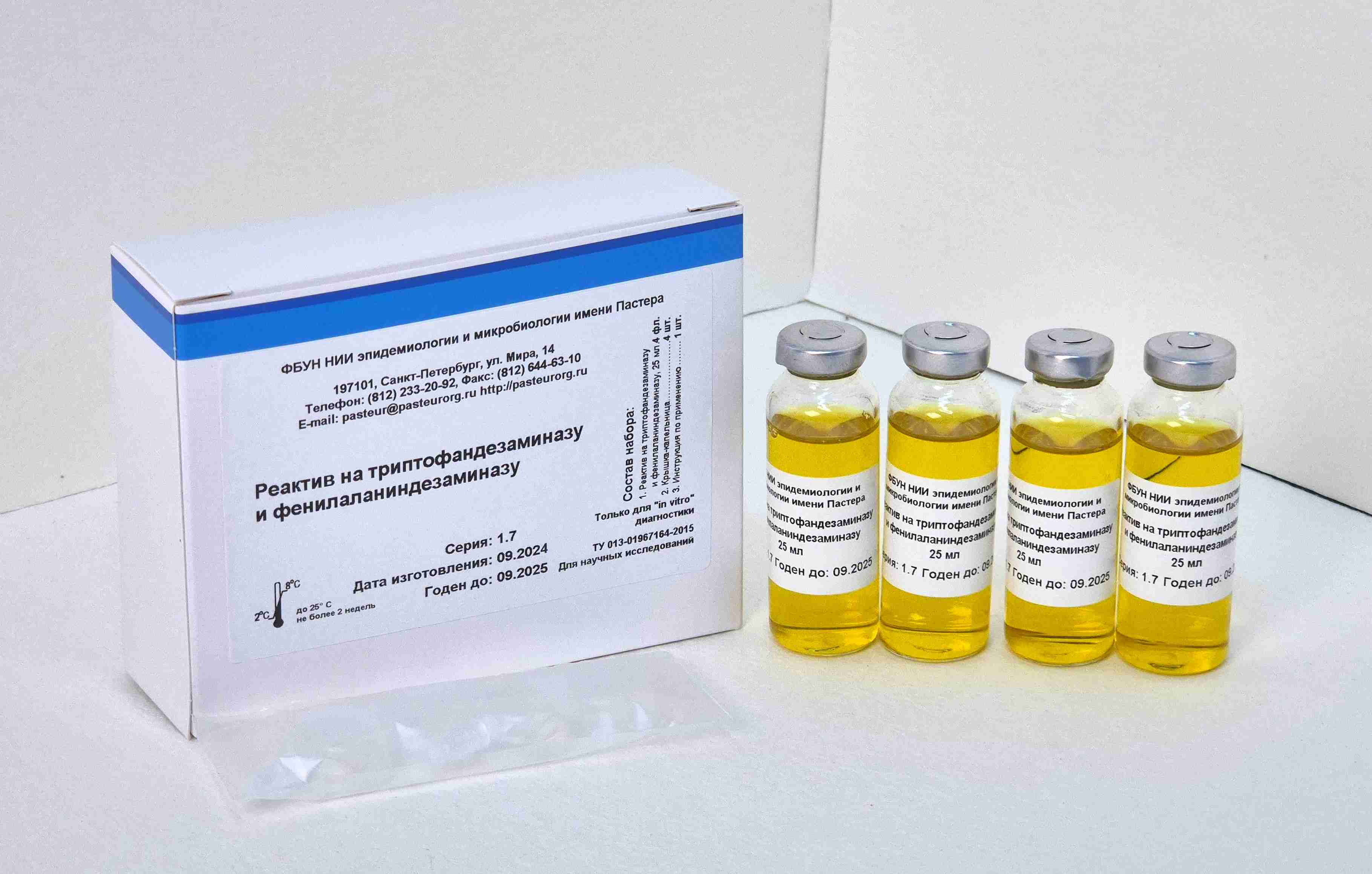 Реактив предназначен для выявления триптофандезаминазы и фенилала-ниндезаминазы бактерий при культивировании их на питательных средах, содержащих триптофан и фенилаланин. Состав: реактив на триптофандезаминазу и фенилаланиндезаминазу, 25 мл - 4 фл.; крышка-капельница - 4 шт. Реактив готов к немедленному использованию. Учёт проводят через 1-3 мин после внесения реактива. При наличии триптофандезаминазы бактерий питательная среда приобретает бурую окраску. При наличии фенилаланиндезаминазы питательная среда приобретает зелёную окраску. Бактерии, дающие положительный результат, относятся к группе содержащих триптофандезаминазу и (или) фенилаланиндезаминазу. Область применения – для научных исследований.